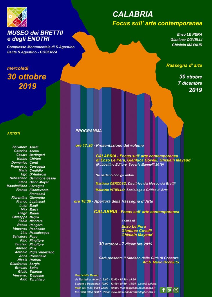 In occasione dell'apertura della Rassegna d'Arte CALABRIA, Focus sull'arte contemporanea, presso il Museo dei Brettii e degli Enotri, all'interno del complesso monumentale di S. Agostino, a Cosenza il 30 ottobre 2019 è stato presentato l'omonimo volume degli autori Enzo Le Pera, Gianluca Covelli e Ghislain Mayaud.
