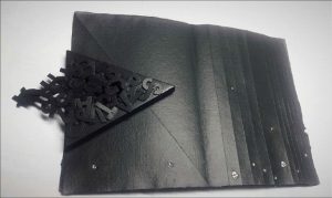 Libro/oggetto in tela, pvc, legno, ferro